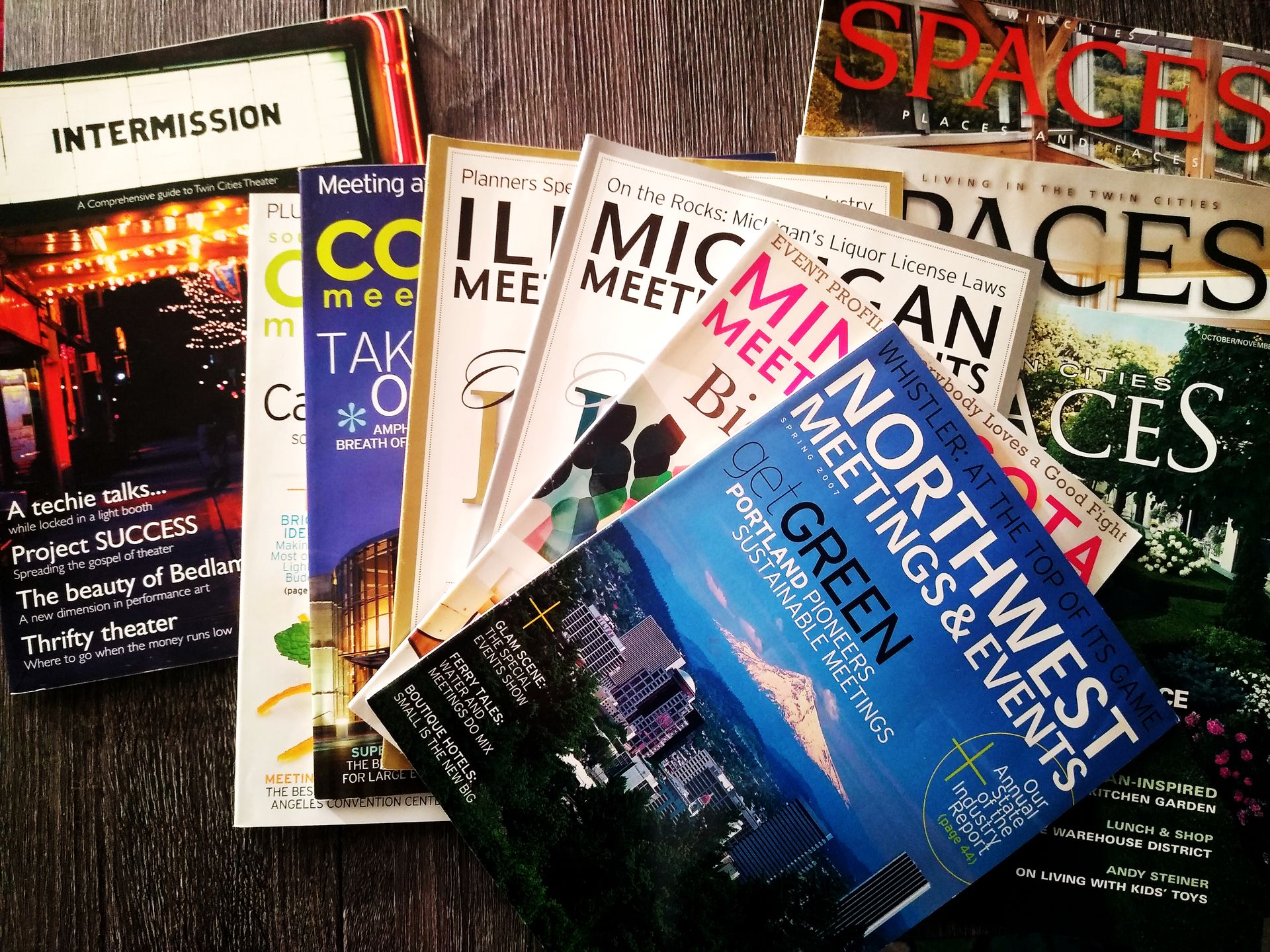 From left to right: Intermission, a student-run magazine I edited and wrote for; Six Meetings & Events magazines I edited and launched as an intern with Tiger Oak Publications, covering California, Colorado, Illinois, Michigan, Minnesota, and the Pacific Northwest; Three editions of Twin Cities Spaces magazine, which I wrote for during and after college.